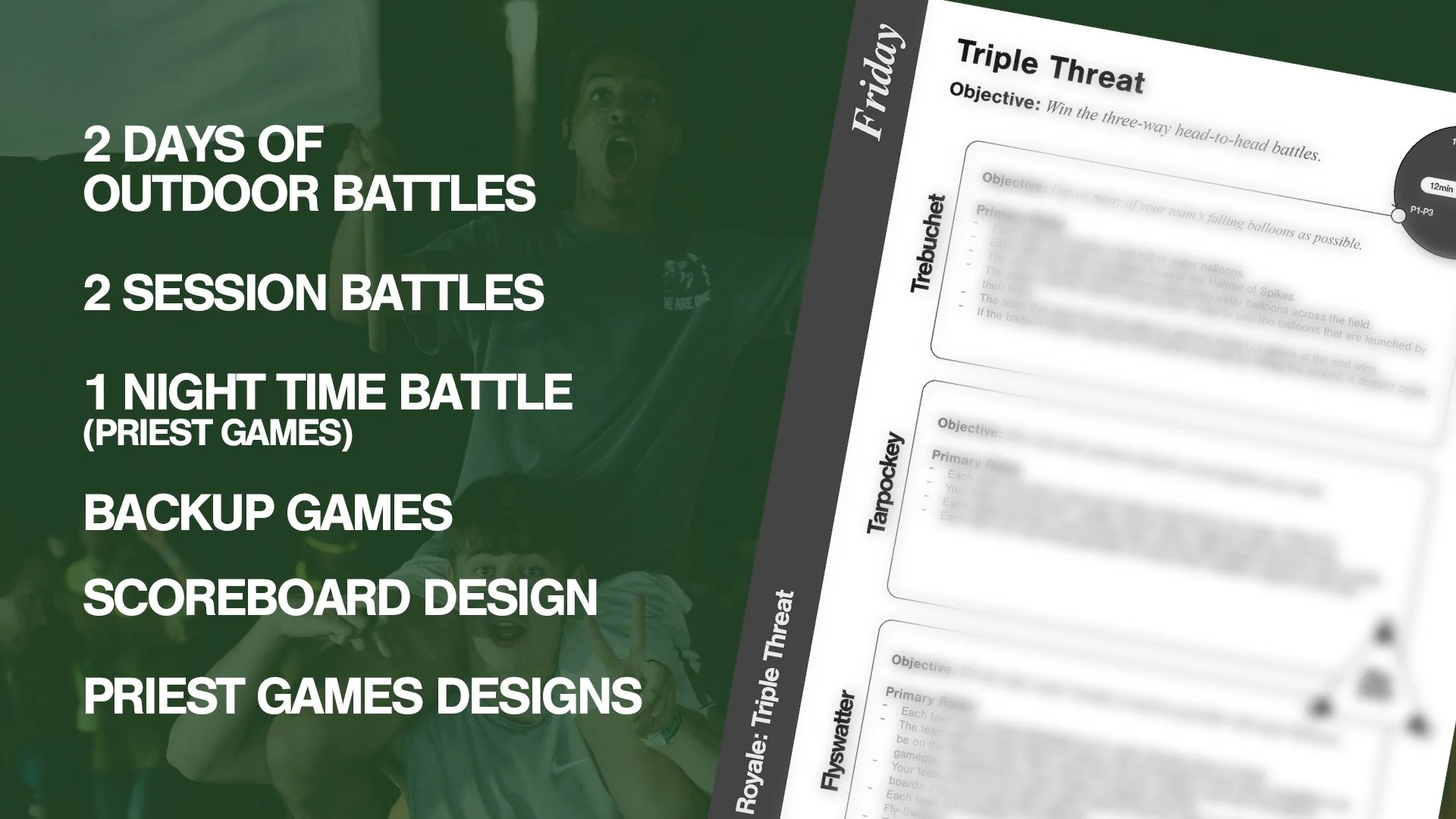 THE BLUEPRINT is your all-inclusive guide to the games of Collision Battles 2024, featuring three days of exciting large group outdoor games, indoor session activities, and unforgettable lip sync battles. This document is crafted to help you recreate the energy and community spirit that define our camp experience.